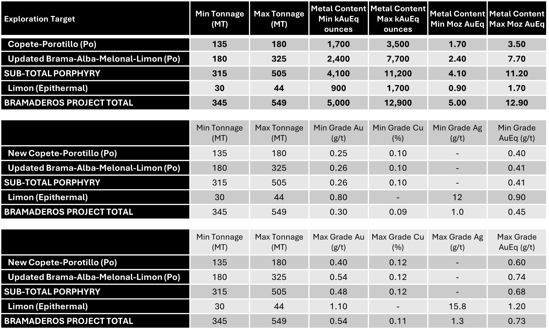 The current Bramaderos Porphyry Exploration Target is reported in accordance with the JORC Code, and is in addition to the 2025 Bramaderos MRE of 3.6Moz AuEq.