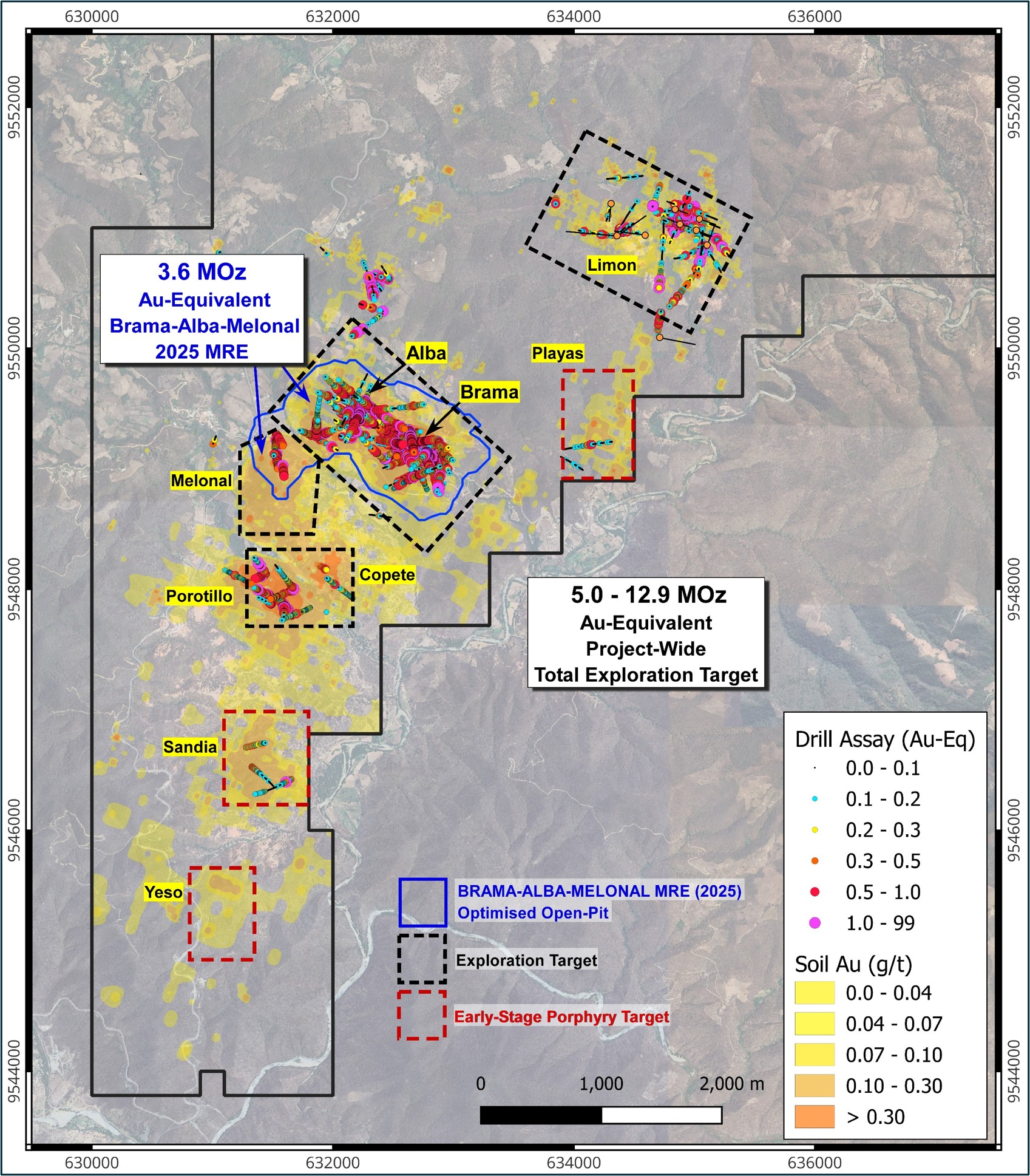 The current Bramaderos Porphyry Exploration Target is reported in accordance with the JORC Code, and is in addition to the 2025 Bramaderos MRE of 3.6Moz AuEq.